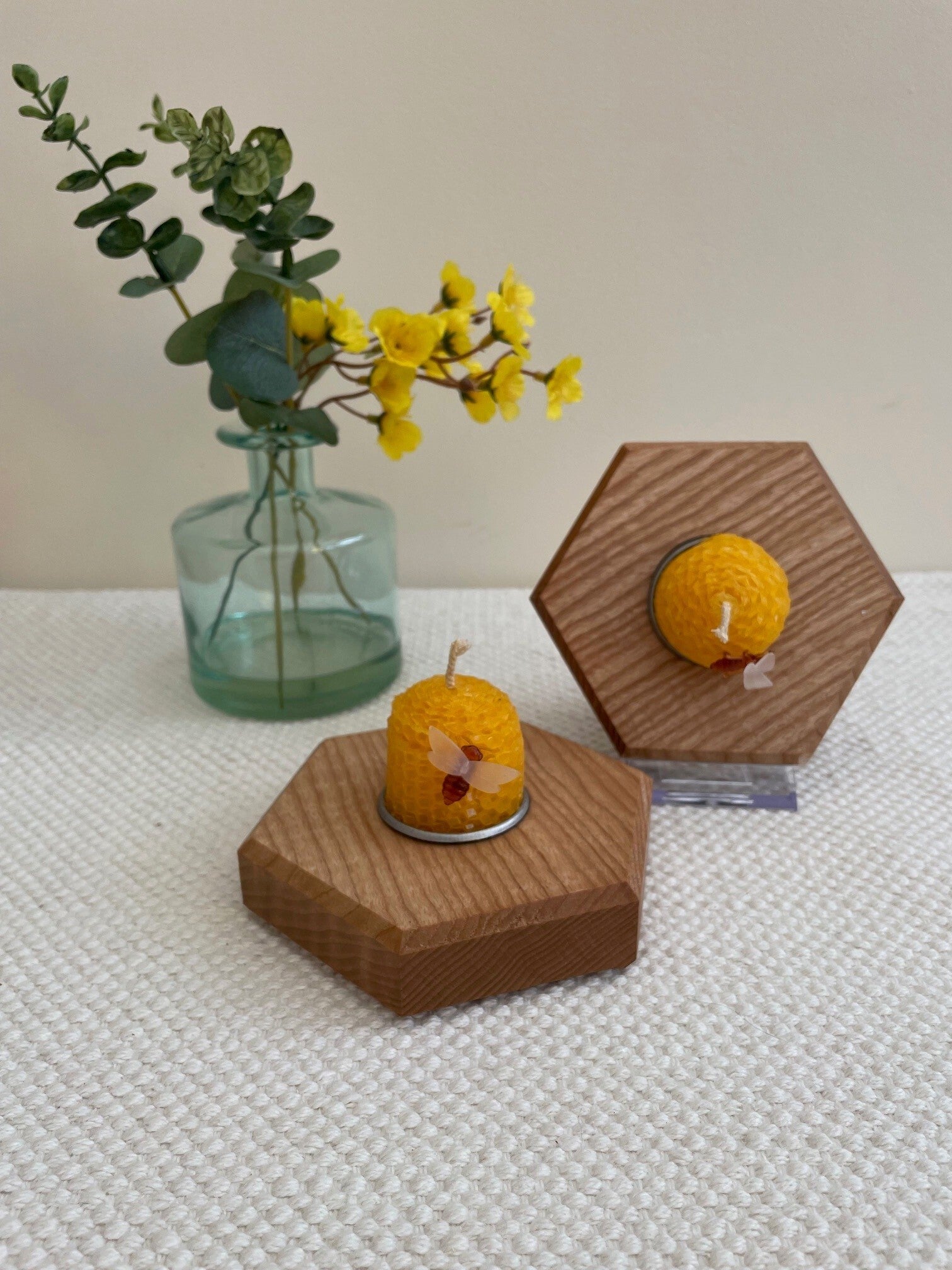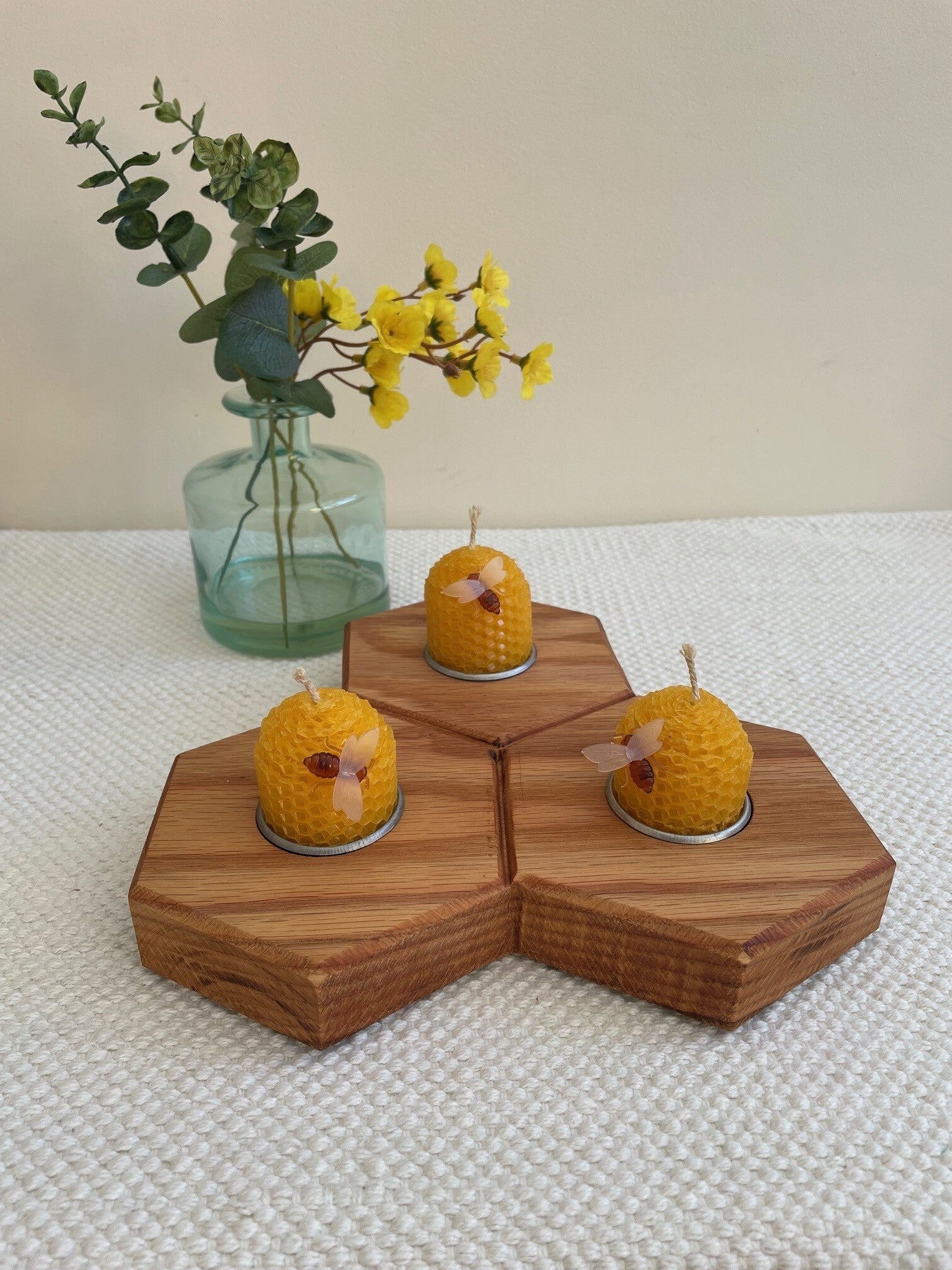 Three Hexagonal Candle Holder with Natural Beeswax Candles (as shown) and plastic removable bee attachment.